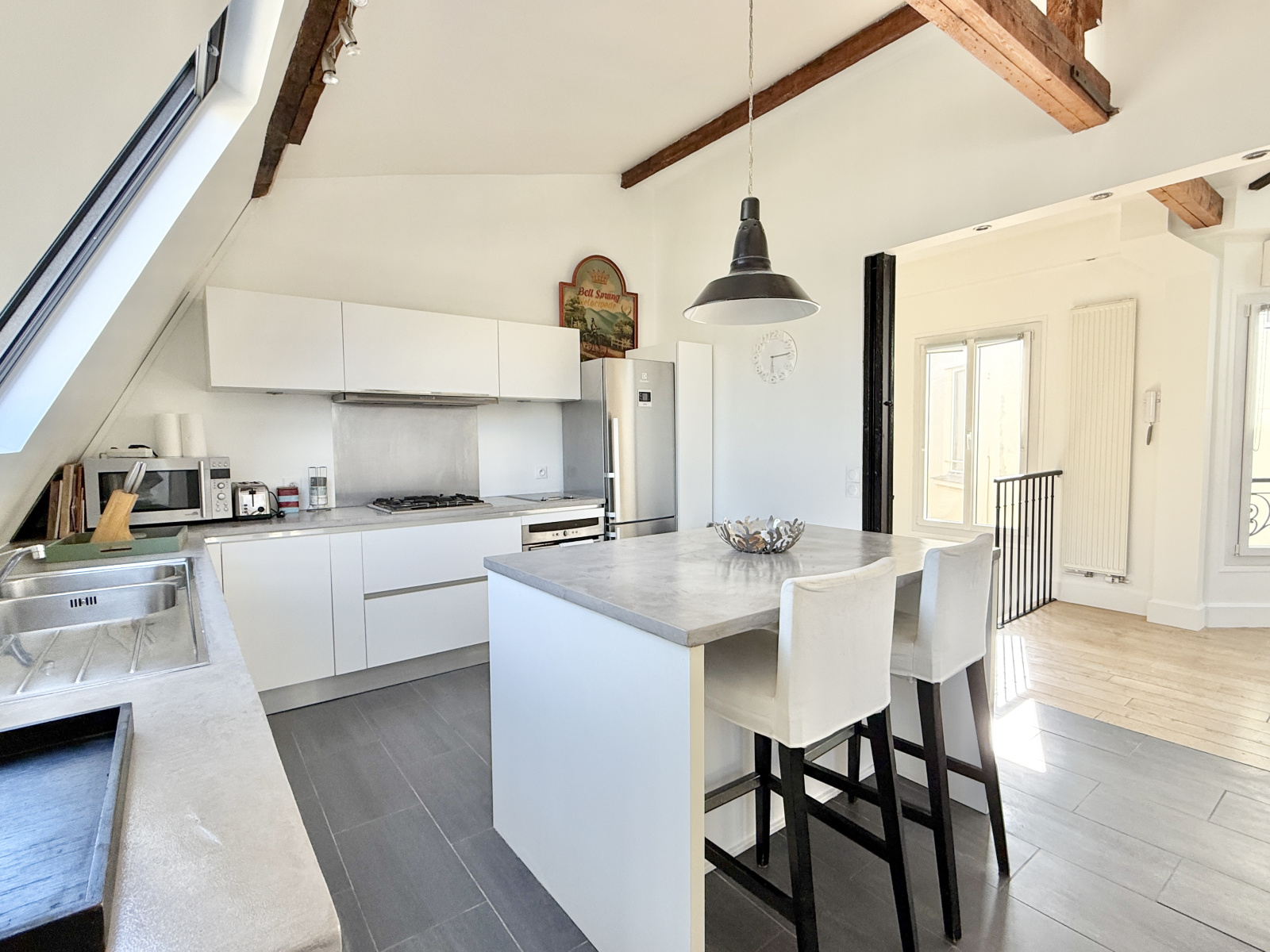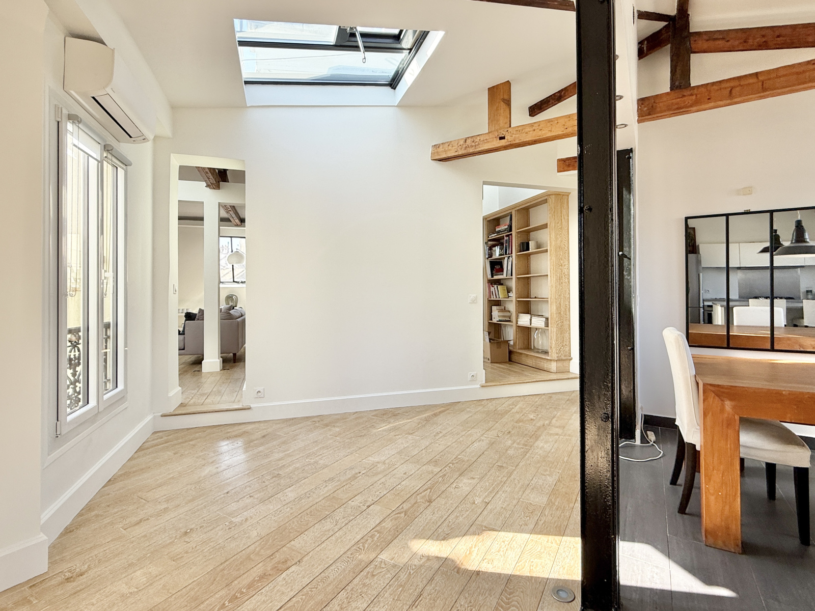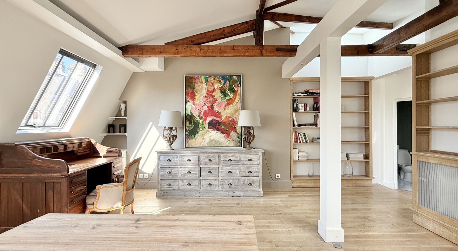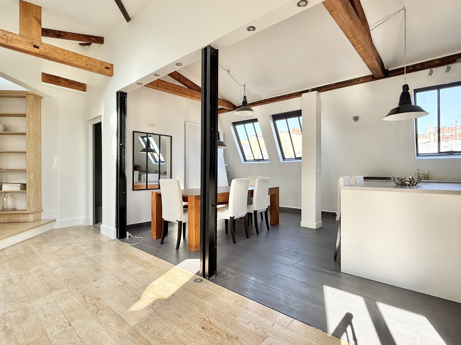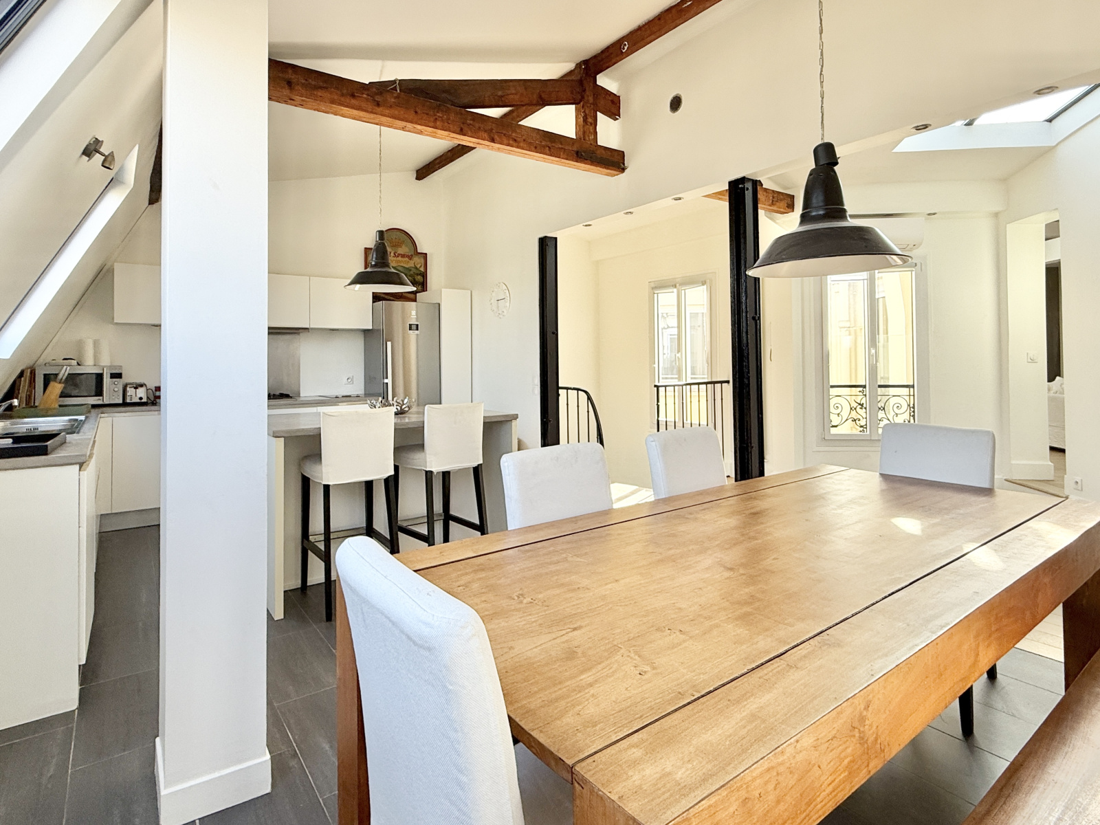 Un dernier étage avec double séjour élégant, une cuisine ouvrant sur une salle à manger.